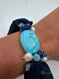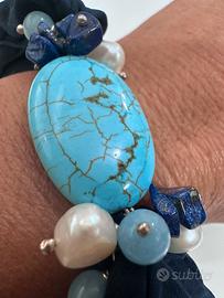 Bellissimo bracciale completamente fatto a mano, con pietra centrale turchese, con lapislazzuli e perle . In argento 925