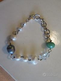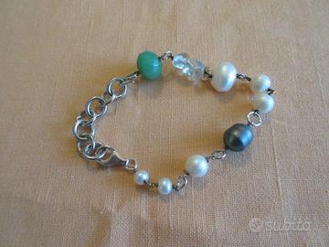 Bracciale in argento 925 . Composto da catena in argento - perle d'acqua dolce bianche e grigia - avventurina verde - cristalli di rocca con montatura in argento a rosario. Fatto a mano. Lunghezza 19,5 cm.