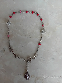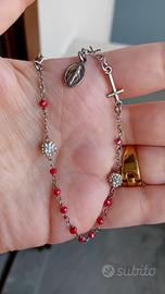 Bracciale rosario in argento 925 con grani rossi, sfere con strass, immagine sacra e croce.