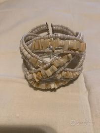 Bracciale artigianale color panna con perline e pietre . Estivo , luminoso ed adattabile a ogni polso .