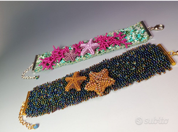 Bracciale ispirato al mare, con stelle marine tridimensionali e dettagli in rilievo, tessuto completamente a mano con microperle di vetro di alta qualità.