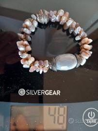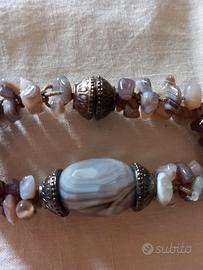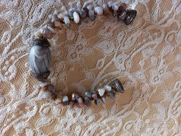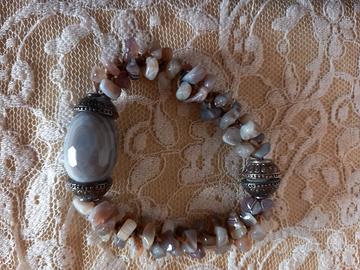Splendido bracciale realizzato a mano, che si distingue per la qualità dei materiali e l'accurata lavorazione tessile. Non è il classico bracciale elastico: è un pezzo unico di bigiotteria artigianale di alto livello. Dettagli dei Materiali: Pietre: Vere pietre di Agata del Botswana. Presenta una grande pietra centrale ovale con meravigliose venature naturali e numerosi frammenti laterali nelle tonalità del grigio, rosa cipria e beige. Base: Le pietre sono cucite a mano con un intreccio di filo su una morbida base in raso grigio, che garantisce un comfort eccezionale sulla pelle. Chiusura: Pratica ed elegante calamita con decorazione metallica a sbalzo, sicura e facilissima da allacciare in autonomia. Caratteristiche Tecniche: Peso: 47 grammi (consistente e materico, conferma l'autenticità delle pietre dure). Struttura: Solida e fissa (senza elastico), progettata per durare nel tempo. Lunghezza: Circa 19-20 cm. Condizioni: L'articolo è in condizioni eccellenti, pari al nuovo. Le foto mostrano chiaramente la bellezza delle striature naturali delle pietre.
