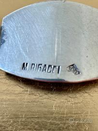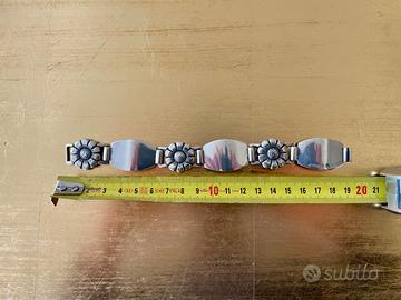 Pregevole bracciale realizzato in argento titolo 900 dall’argentiere argentino M. Rigacci risalente a fine anni ’90. Il bracciale, la cui punzonatura è ben visibile, presenta piccole maglie a tema floreale che si alternano a più grandi maglie lisce a forma simil-ovoidale troncata. Tutte le maglie sono leggermente convesse per aderire meglio alla forma del polso. Peso: 62g Lunghezza: 20cm circa A disposizione per eventuali chiarimenti e fotografie aggiuntive!