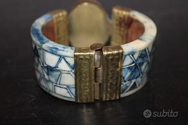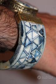 Il motivo triangolare, minuziosamente intagliato e colorato, crea un effetto visivo di grande impatto, richiamando lo stile delle antiche lavorazioni decorative orientali. La struttura solida, con apertura a cerniera, lo rende facile da indossare e confortevole al polso.