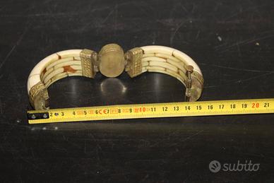 Il design robusto e armonioso mette in risalto la bellezza delle venature naturali dell’osso e la lucentezza della pietra centrale, incorniciata da dettagli in ottone con motivi incisi. La chiusura a cerniera ne facilita l’indosso, rendendolo comodo e sicuro.