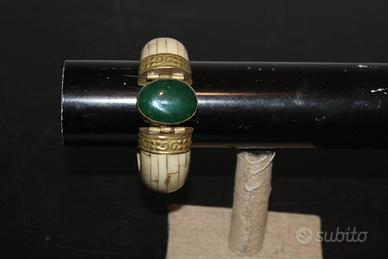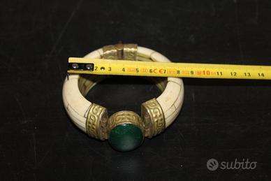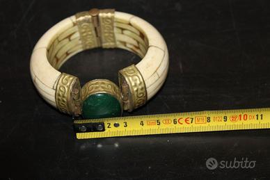 Elegante e ricco di fascino etnico, questo bracciale realizzato a mano in India unisce tre materiali naturali di grande impatto: l’osso finemente lavorato, una pietra centrale di intenso verde (possibile avventurina o giada) e inserti decorativi in ottone inciso.