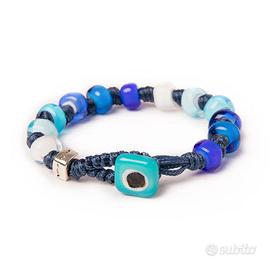 Braccialetto per uomo e donna con perle di vetro di colore blu, celeste, bianco e cordoncino blu in poliestere cerato.