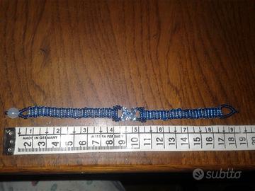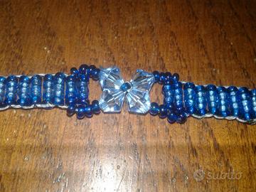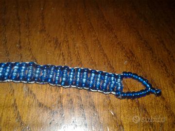 Bracciale blu in perle di vetro e plastica fatto a mano, poco usato, perfetto. Si segnala cambio di colore nel tessuto, come da ultima foto, a causa della chiusura dello stesso con l'accendino.