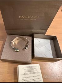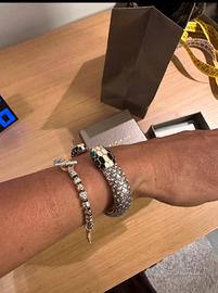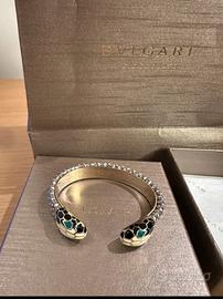 Bracciale rigido Serpenti Forever con inserti in karung metallizzato beige latte opale. Accattivante motivo Serpenti contraire con squame in smalto nero e glitter beige latte opale e occhi in smalto verde . prezzo negozio 630€