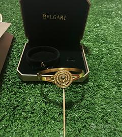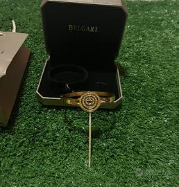 Vendo bracciale rigido ispirato all'iconico design Bvlgari, perfetto per chi cerca un accessorio di classe dal fascino senza tempo. Il gioiello presenta un medaglione centrale finemente inciso con il logo "Bvlgari Roma" e un punto luce centrale che dona una brillantezza discreta ma sofisticata. Il bracciale viene venduto con il suo corredo completo, ideale per un regalo: Scatola originale Bvlgari con interno in velluto nero. Shopping bag coordinata color champagne con logo in rilievo. Consegna velocissima 24/48 h e disponibilità per qualsiasi domanda.