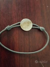 Bracciale Bvlgari unisex originale con doppio logo inciso sul disco centrale in argento 925. L'inserto è in un elegante smalto verde scuro. Il disco presenta alcuni leggeri graffi superficiali dovuti al normale utilizzo, visibili solo in controluce. Sul Retro Presenta segni di ossidazione naturale dell'argento; è possibile farlo tornare lucido con una pulizia professionale o prodotti specifici per l'argento. Il cordino in tessuto è in buone condizioni e regolabile per adattarsi a ogni polso
