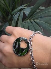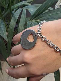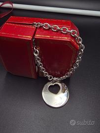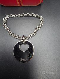 Splendido bracciale di Cartier con catena maglia ad anelli in argento 925 e ciondolo tondo con intagliato un cuore e la scritta del brand in acciaio.