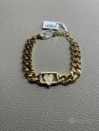 Il bracciale è caratterizzato da una catena groumette dorata di grande tendenza, impreziosita da un tag centrale a forma di cuore interamente ricoperto di zirconi bianchi brillanti. Un accessorio iconico, perfetto per dare un tocco glamour a ogni outfit o come idea regalo.
