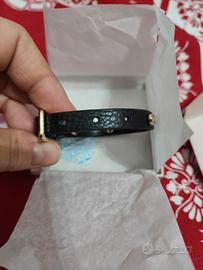 bracciale secondo me unisex, coccinelle, originale con scatola mai usato, regalo di compleanno, allego scontrino di autenticità, di pelle nero granulato, borchie color oro.