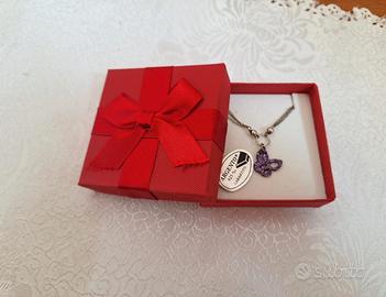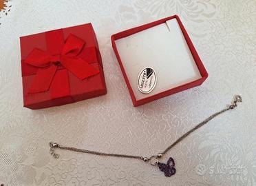 bracciale in argento, mai utilizzato, adatto per donna/ragazza, con ciondolo a forma di farfalla con brillantini viola, lunghezza variabile 18 - 20 cm.