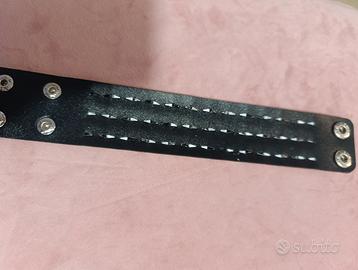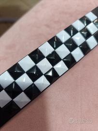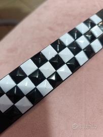 Bracciale con borchie bianco/nero, punk/ rock , chiusura a bottone regolabile Lunghezza fino al primo bottone 19 cm Lunghezza fino all'ultimo bottone 21,5 cm Larghezza 3,8 cm Nuovo, prezzo gia scontato visto che ha qualche segnatura sulle borchie a causa di come ce l'avevo in esposizione
