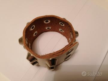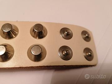 Bracciale bianco in cuoio con borchie in acciaio inox. Doppia chiusura a clip per calibrare la lunghezza.
