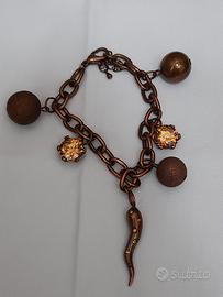 bracciale acciaio di color rame con ciondoli due a sfera due con pietre in vetro di color giallino e un corno con sei piccoli brillantini chiusura e colore tutto integro