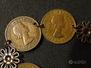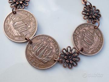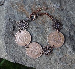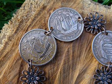 Tre monete inglesi da mezzo penny 1965 in bronzo (ma il colore è quello del rame) e tre "margherite" in lega metallica. Misura 18.5-19.5 + catenella di prolunga. Per chiuderlo usando la catenella serve aiuto. Sull'anello più stretto veste giusto un polso da 17 cm. L'ultima foto mostra il retro del bracciale. Le monete si possono lucidare di più ma personalmente preferisco lasciare parte della patina originale del tempo.