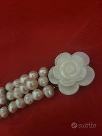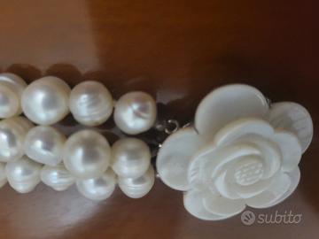 Bracciale a 3 giri con perle coltivate barocco ,con fiore in madreperla,nuovo idea regalo , no perditempo.