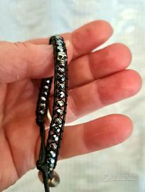 Bracciale cuoio e pietre pirite e teschio "Mychau".Il Mychau è un prodotto artigianale realizzato in Vietnam impiegando solo pietre naturali, al quale una volta giunto in Italia, viene aggiunta la chiusura in argento 925. Indossato pochissime volte .