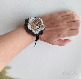 Bracciale artigianale unico, realizzato all’uncinetto con filato lana, in tonalità naturali: marrone, beige e bianco, impreziosito da un centro dorato. Il fiore tridimensionale è montato su un elegante nastro in velluto nero, che avvolge il polso con stile e delicatezza. Perfetto per chi ama gli accessori romantici, boho o dal tocco vintage. Nuovo, mai indossato, senza cartellino.