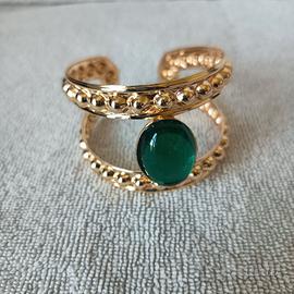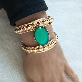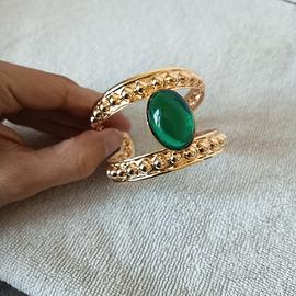 Bracciale rigido tipo cuff in metallo dorato lucido con design elegante e moderno. Struttura a doppia fascia con lavorazione a sfere e pietra centrale verde effetto smeraldo taglio cabochon, ideale per valorizzare il polso e dare luce all’outfit. Modello semi-aperto, facile da indossare e adattabile alla maggior parte dei polsi. ✨ Caratteristiche: Colore: oro lucido Pietra verde effetto smeraldo Design cuff doppia fascia Stile: elegante, boho chic, moderno Condizioni: come nuovo Perfetto per outfit estivi, eleganti o casual con un tocco deciso. 📦 Spedizione esclusiva tramite piattaforma con metodo tracciato. Imballaggio accurato. 🚫 Non disponibile consegna a mano.