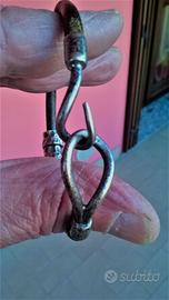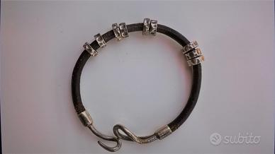 Bracciale cuoio e argento 925 (marchio 925 sul gancio più piccolo, quello a forma di ?). Di aspetto "vissuto", usato ma ancora molto bello. Lunghezza circa 21 cm.