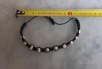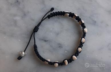 Braccialetto in macramè da Medjugorje realizzato con cordino nero intrecciato e 10 piccole pietre naturali provenienti dalla collina dove è apparsa la Madonna. Chiusura regolabile con nodo scorrevole e all’estremità un piccolo charm a forma di cuore con il volto della Madonna. È un braccialetto da preghiera pensato per accompagnare la recita del Rosario. Condizioni ottime. Mai indossato.