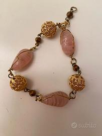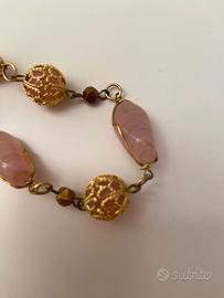 Bracciale con pietre rosa ovali e rotonde incastonate dentro reticolati simil filigrana. No metalli preziosi. Nuovo senza cartellino. Misura circonferenza cm 18.