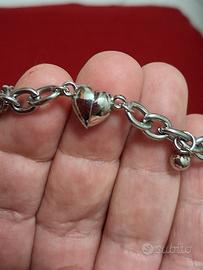 Vendo bracciale da donna di bigiotteria con pendagli a forma di perle color argento e perline fucsia. La chiusura è a forma di cuore calamitato.