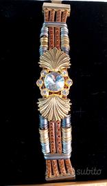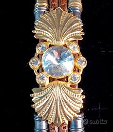 Bracciale anni '80 elegante con elementi in cuoio. Le parti in metallo dorato non sono scolorite ed i cristalli danno molta luminosità. Tenuto molto bene. Lungo 20 cm e largo 2,5. Prezzo trattabile.