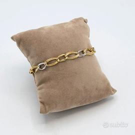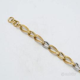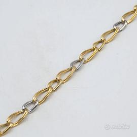 Bracciale donna Etoile in oro giallo e bianco 18 kt grammi 4,4 lungo cm. 18 + 1,5. La lavorazione è a catena con maglie doppie e ovalizzate. Prodotto made in Italy munito di marchio di fabbrica e completo di confezione e certificato di qualità rilasciato dalla Gioielleria.
