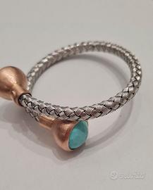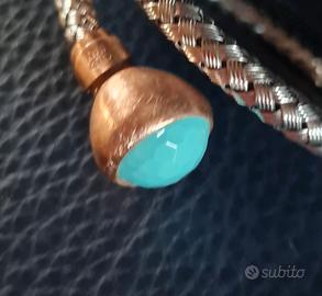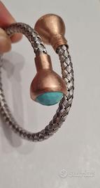 Bracciale in argento 925, come nuovo, modello incrociato nella parte superiore con finitura in argento placcato colore rame , sono presenti 2 pietre di pasta di turchese. Molto importante, la parte superiore del bracciale , grazie alla particolare lavorazione, non gira sotto il polso. Comunque adattabile al polso.