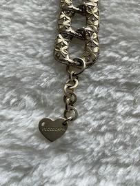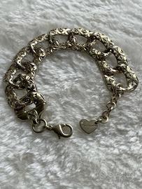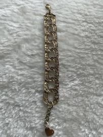 Elegante bracciale da donna con maglia grumetta. Un accessorio che aggiunge un tocco di stile. Chiusura a moschettone. La doratura è leggermente schiarita. Design a maglia. Charm a forma di cuore con logo inciso. Foto con misure. FUOCOCAPRI