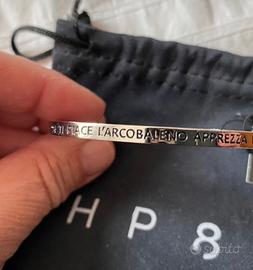 Bracciale rigido da donna in Acciaio Nuovo, in confezione originale Frase incisa "Se ti piace l'arcobaleno apprezza la pioggia"