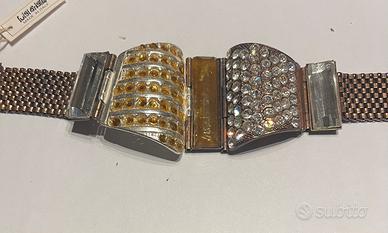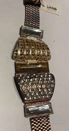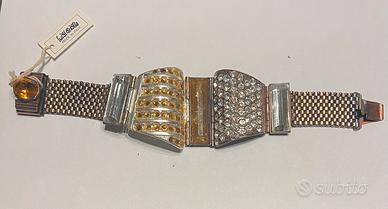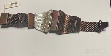 Bracciale vintage Luigi Briglia a fascia con maglia a griglia color rame/bronzo e inserti decorativi di strass buanchi e strass color ambra