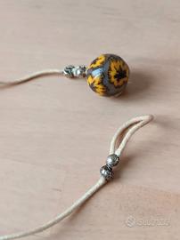 Ciondolo tondo decorato con fiori e perline sferiche con filo bianco per la chiusura. Lunghezza totale della collana circa 34 cm, lunghezza pendente 7 cm, dimensione palline 1 cm.
