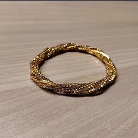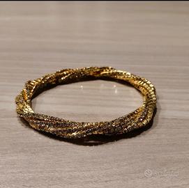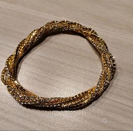 Bracciale, di biotteria, elastico dal design a spirale intrecciata, composto da più file alternate di maglie quadrate color oro e file impreziosite da piccoli strass brillanti. Essendo senza ganci e montato su una struttura elastica resistente, si adatta facilmente a diverse misure di polso. Raffinato ed elegante, è ideale per cerimonie o per dare luce a un outfit serale.