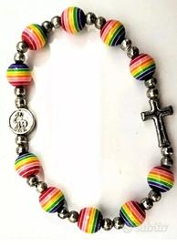 Bracciale elastico con perline color arcobaleno, madonnina e croce.