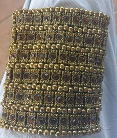 Bracciale elastico in metallo dorato massiccio (credo ottone) e strass in vetro. h 10 cm larghezza 9 cm. Mai usato
