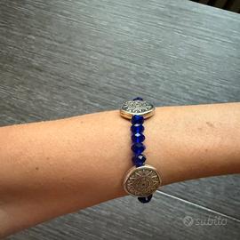 Bracciale elastico con pietre trasparenti blu e elementi metallici. Per polsi di 19 cm.