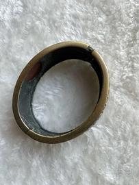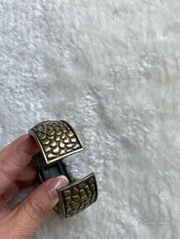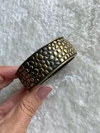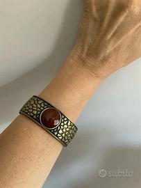 Bellissimo bracciale da donna in metallo rigido color bronzo. Apertura a molla. Presenta una texture che ricorda la pelle di serpente. Pietra centrale sfaccettata marrone. Foto con misure. Finitura anticata.