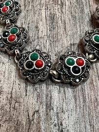 Braccialetto vintage in metallo dal raffinato motivo floreale, caratterizzato da una lavorazione decorativa curata e da pietruzze colorate che impreziosiscono ogni fiore. Un accessorio dal fascino retrò, ideale per completare look eleganti, boho o ispirati al vintage.