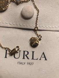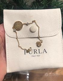 #braccialefurla #placatooro furla studs metallo placato oro + strass modello con scritta incisa logo furla 1927 chiusura a moschettone catenella regolabile con piccoli cristalli scintillanti il ciondolo presenta micro borchie in rilievo sul retro nel suo sacchetto con codici di riferimento e pochette scamosciata color ghiaccio serigrafata con logo codice VJ00183 K21000 OR000 1 007 UNI