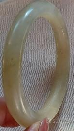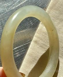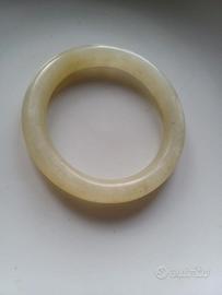 Rarita': bracciale Vintage anni 70/80.VERA pietra di GIADA CINESE.Non TRATTATA,Ossia non sottoposta al processo di aumento del colore che qui e' NATURALE tendente al verde mela.Piacevole al tatto.Preziosa la lavorazione per rendere arrotondata la giada e notevole la quantita' di pietra usata per renderla un bracciale circolare.Interno diametro cm.6.Gioiello prezioso per la difficile reperibilita' sul mercato. La proprietaria del prezioso pezzo si assume la responsabilita' circa la dichiarazione della autenticita' della giada.