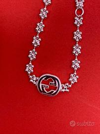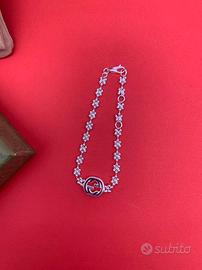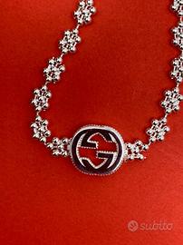 Ciondolo con logo Gucci, bracciale con fiocco di neve, molto bello, intatto, senza usura o danni, originale, argento 925, fornito con confezione.
