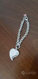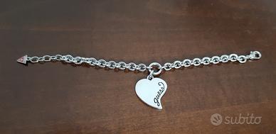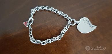 💖 Bracciale Guess dal design iconico e contemporaneo, realizzato in acciaio con catena ad anelli e impreziosito da un elegante ciondolo a cuore con logo Guess e il caratteristico triangolino rosso. ✨ Un accessorio distintivo e riconoscibile, perfetto per chi ama dettagli di stile firmati e mai banali. 👗 Come valorizza i tuoi outfit: Perfetto con jeans e t-shirt per aggiungere un tocco glamour al look quotidiano. Ideale con camicie o blazer per un effetto curato e moderno. Bellissimo con abiti semplici per dare luce e personalità . Da indossare anche insieme ad altri bracciali per uno stile trendy e attuale. 💫 Un gioiello versatile che completa ogni look, dal casual allo chic, con un tocco fashion firmato Guess. Perfetto anche come idea regalo. ✨ Dettagli: Lunghezza: circa 21 cm. Materiale: acciaio. Condizioni: nuovo, mai indossato,senza scatola originale. Charm cuore con logo Guess + iconico triangolo rosso.