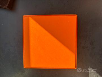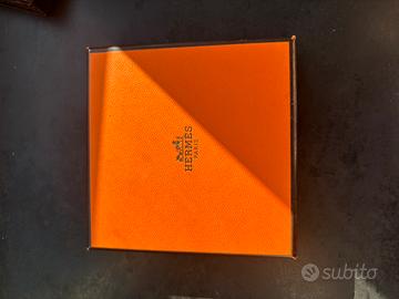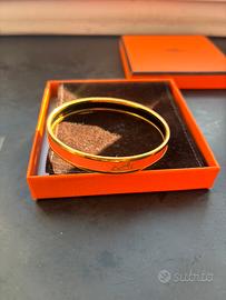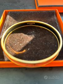 Marca: Hermès Paris Materiale: Metallo placcato oro e smalto Colore: Salmone/ Arancione con hardware dorato Design: Presenta l'iconica carrozza con cavallo (logo "Caleche") stampata delicatamente sullo smalto Vestibilitá: per mani e polso veramente piccolo, io ho un polso 18 cm e non mi entra dalla mano Condizioni: Ottime condizioni generali. 6,5 cm larghezza. Accessori inclusi: Corredato di scatola originale arancione e sacchetto protettivo in velluto marrone firmato. Scatola leggermente segnata. Scrivimi prima di acquistare