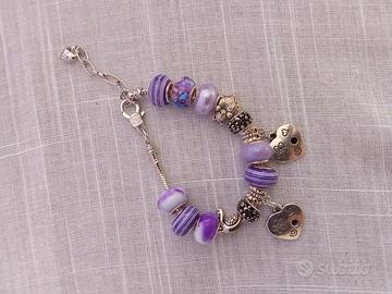Bracciale in acciaio stile Pandora con perle viola in diverse sfumature, inserti fantasia e ciondoli a forma di cuore in acciaio. Nuovissimo. Realizzato a mano.